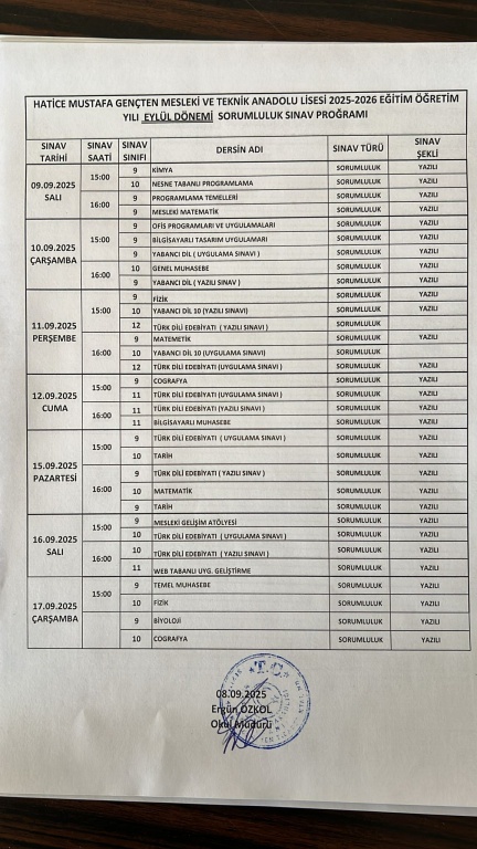 HATİCE MUSTAFA GENÇTEN MESLEKİ VE TEKNİK ANADOLU LİSESİ 2025/2026 EĞİTİM ÖĞRETİM YILI EYLÜL DÖNEMİ SORUMLULUK SINAV PROGRAMI